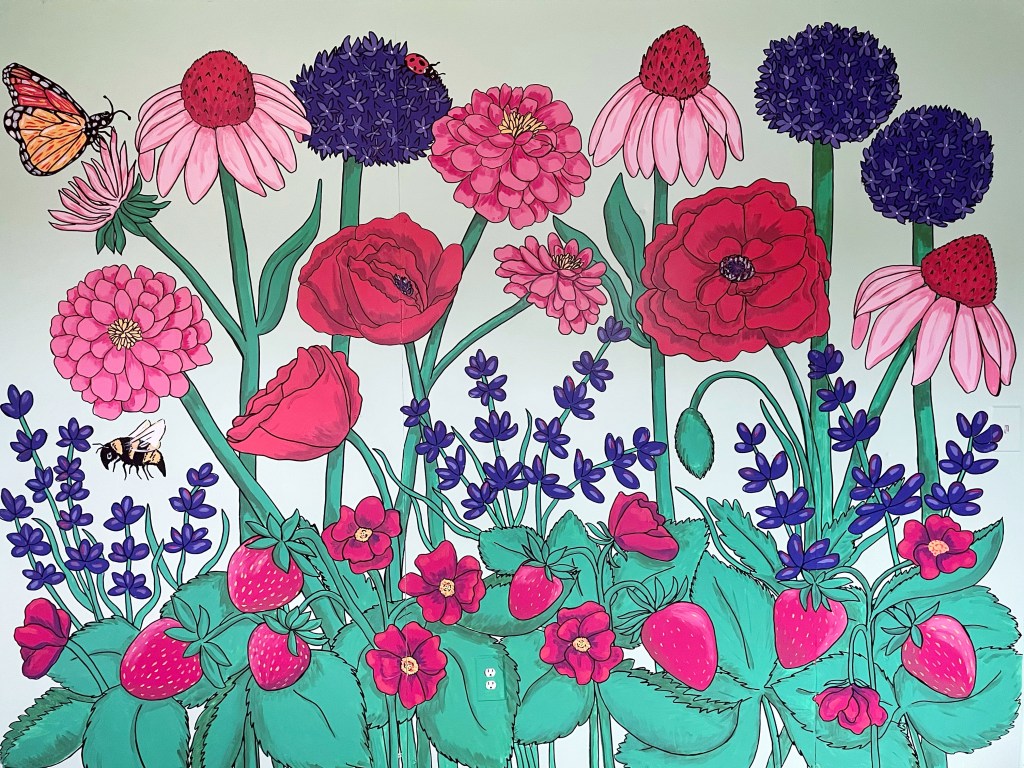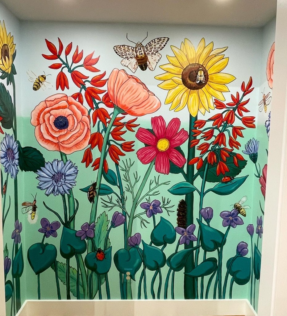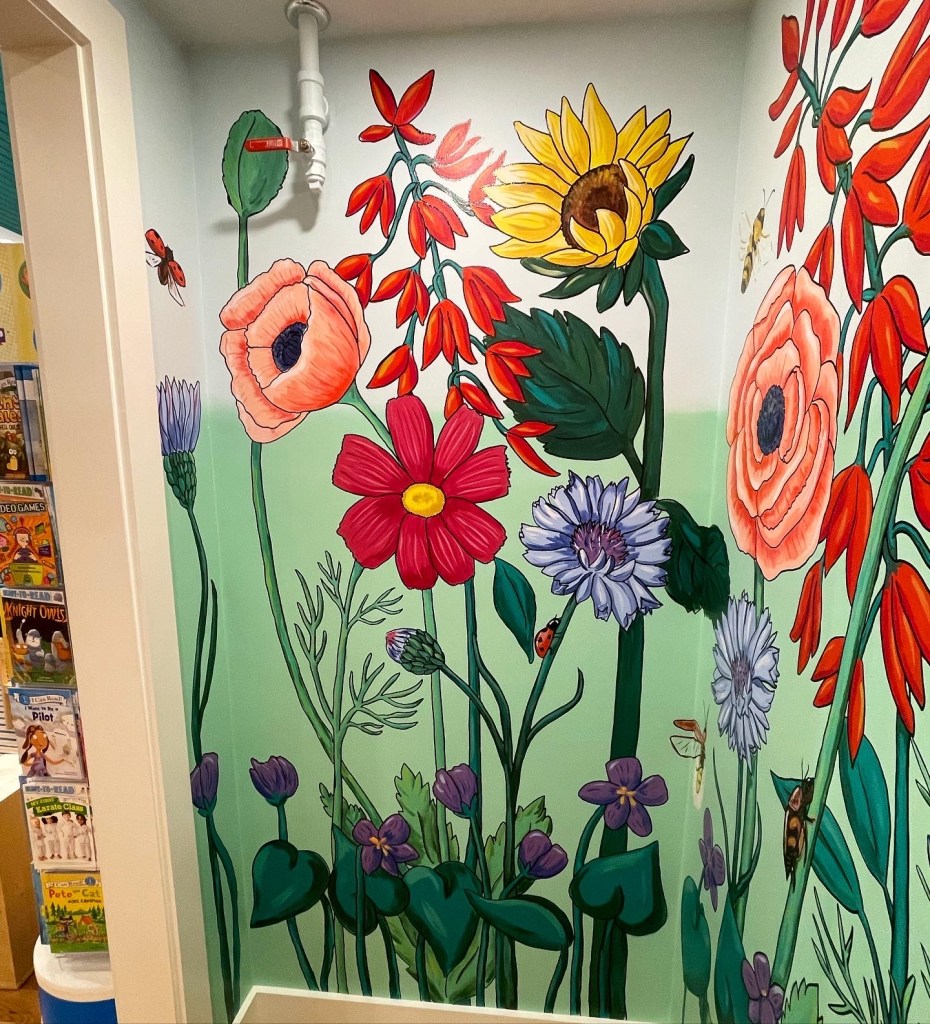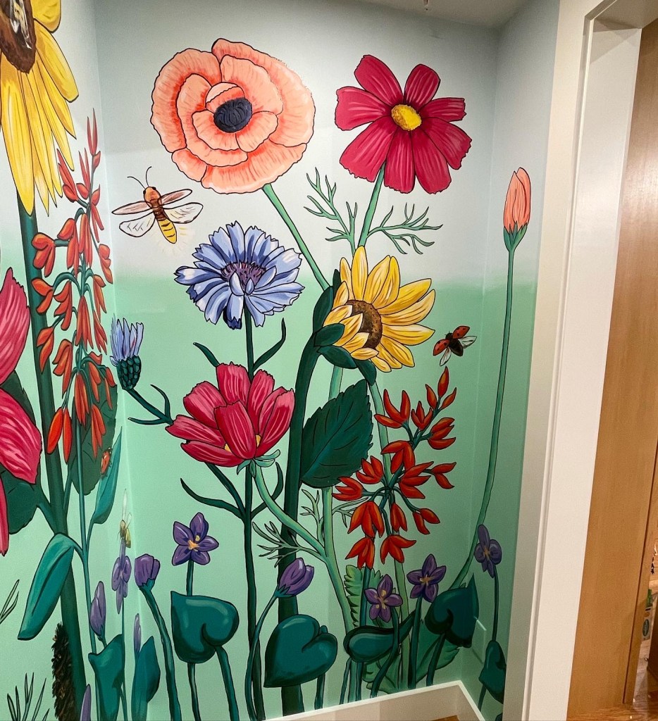 Flower mural in photographer’s studio, 8×10 feet, 2022. Click here for a behind-the-scenes progress video.