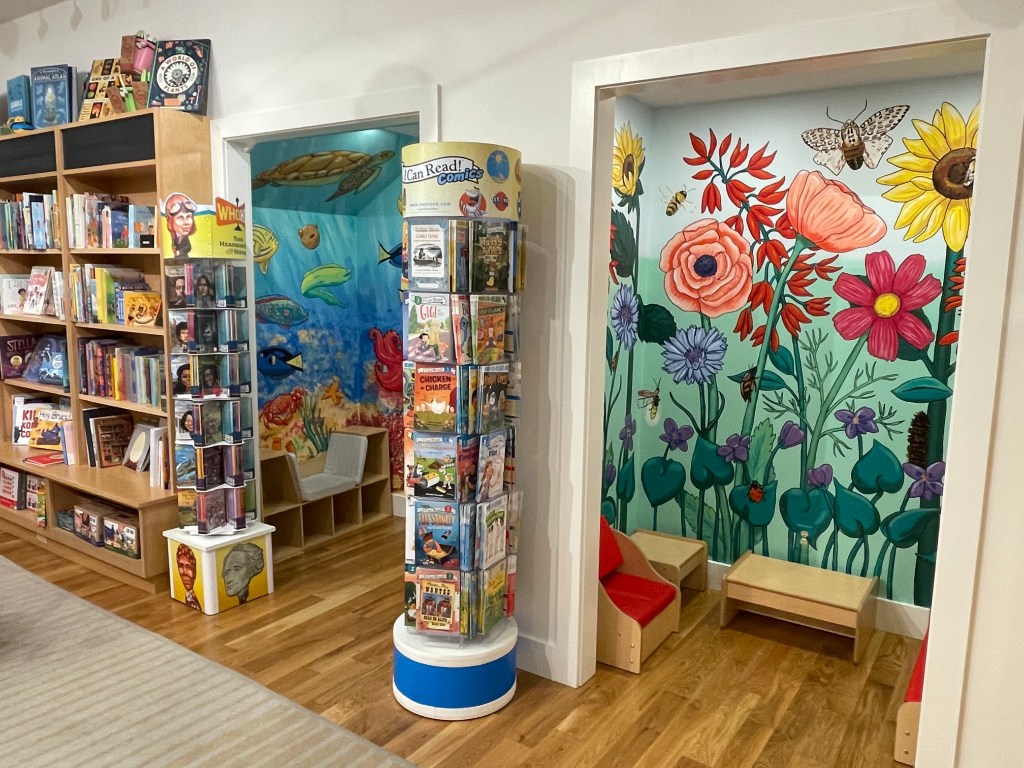 Ocean and flower murals in children’s reading rooms at Charter Books in Newport, Rhode Island, 2022.