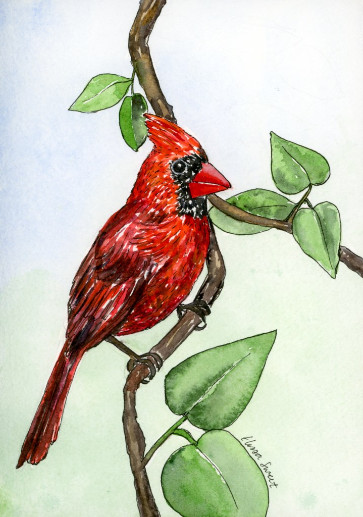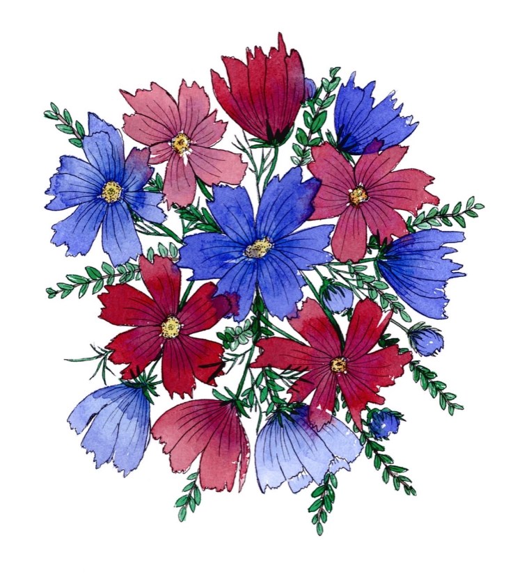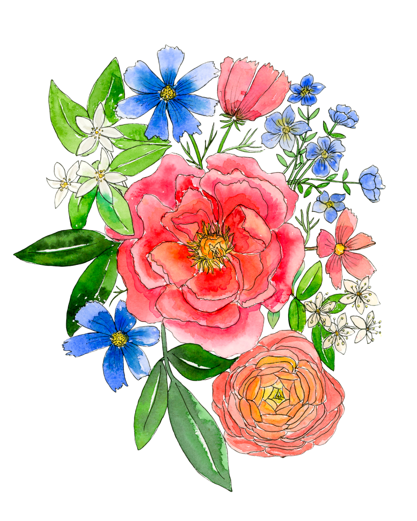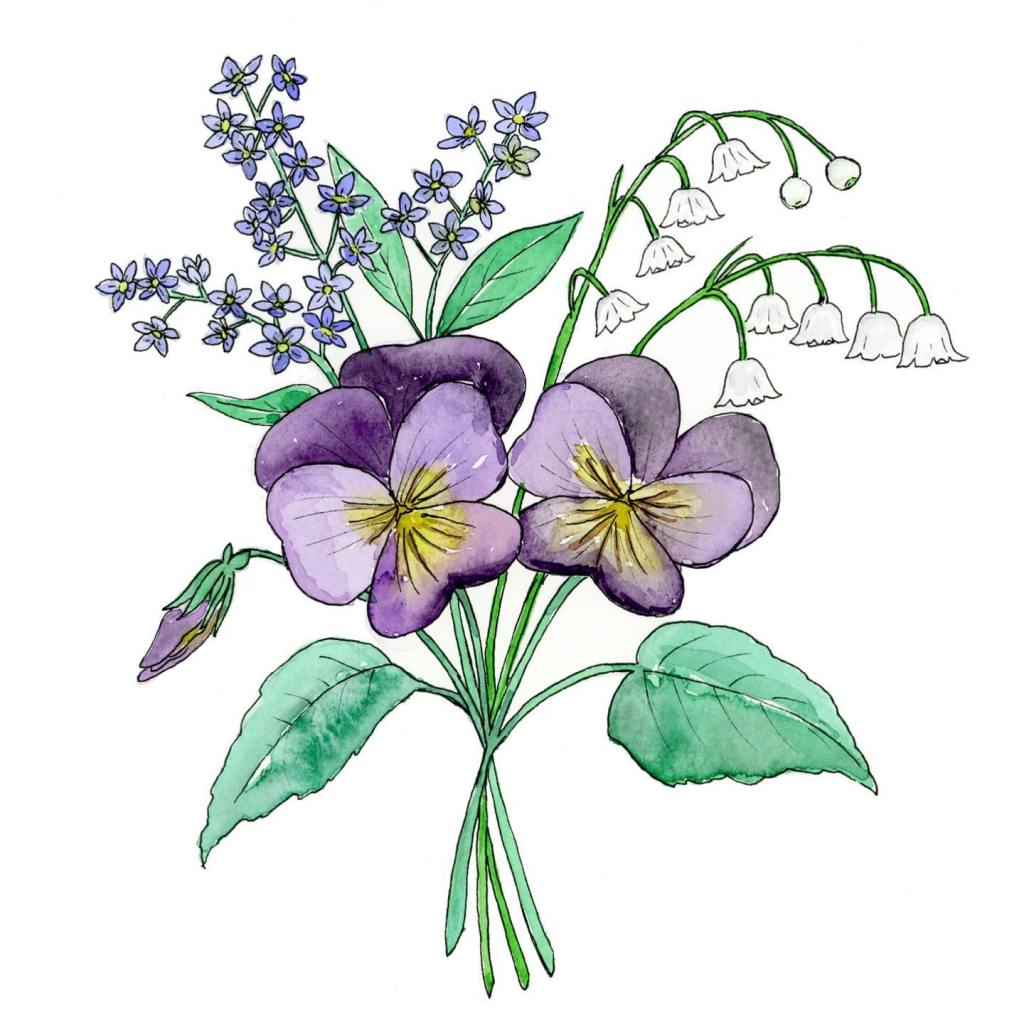 I use watercolor and ink for my nature illustrations. I love creating custom paintings to capture a person’s favorite plant or bird, their wedding bouquet, or flower arrangements centered around a certain theme or meaning, based on the traditional language of flowers.